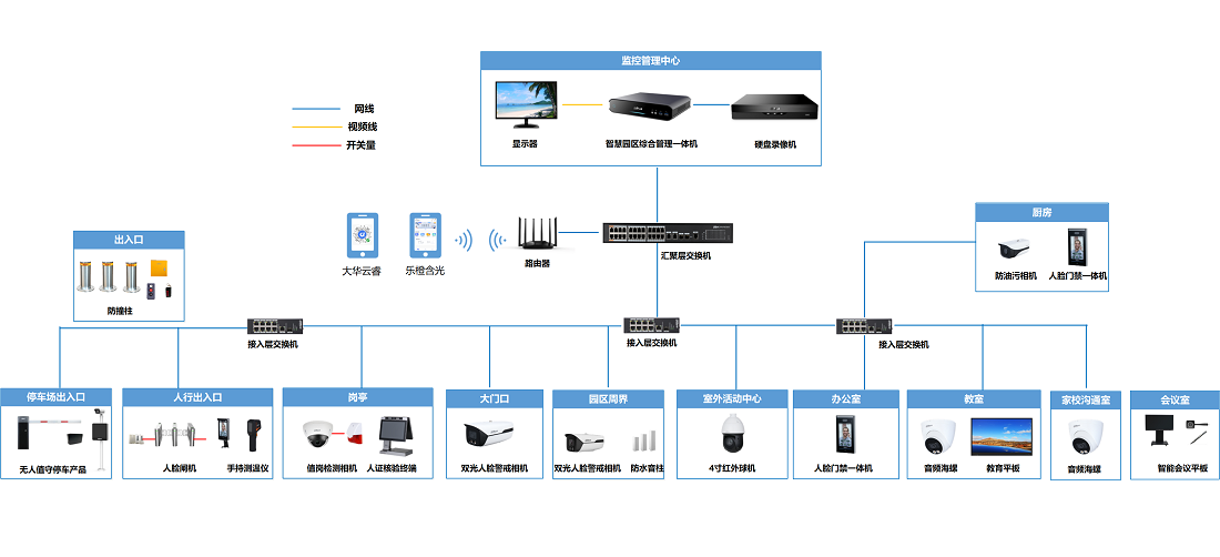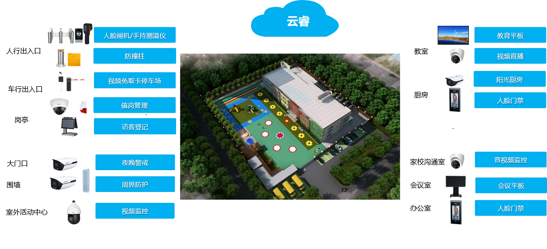 此方案主要应用在人行出入口,车行出入口、岗亭、大门口、围墙、室内外活动中心、教室、厨房、家校沟通室、办公室、会议室等场景